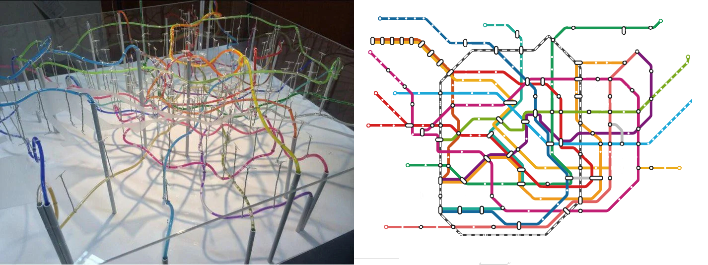Both graphics illustrate the Tokyo underground rail system; both are complex, but the 3D is deeply confusing, whilst the 2D is clear.